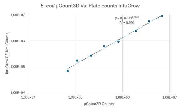 In validation studies comparing µCount3D against IntuGrow CFU/ml agar counts, µCount3D showed a linear correlation (R² = 0.991) across dilution series. Plate counts tended to read slightly higher, likely due to pipetting variability during serial dilutions. Repeated trials confirmed consistent performance, establishing µCount3D as a robust alternative to manual CFU enumeration.
