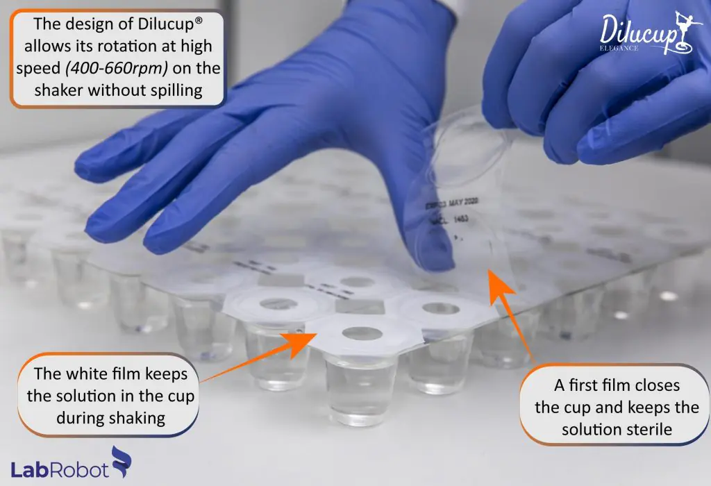 The cup’s design allows for rotation at high speeds (400 – 660 rpm) without spilling. The user is able to open the requested number of Dilucups by tearing-off a thin film which guarantees the sterility and the right volume in each cup.