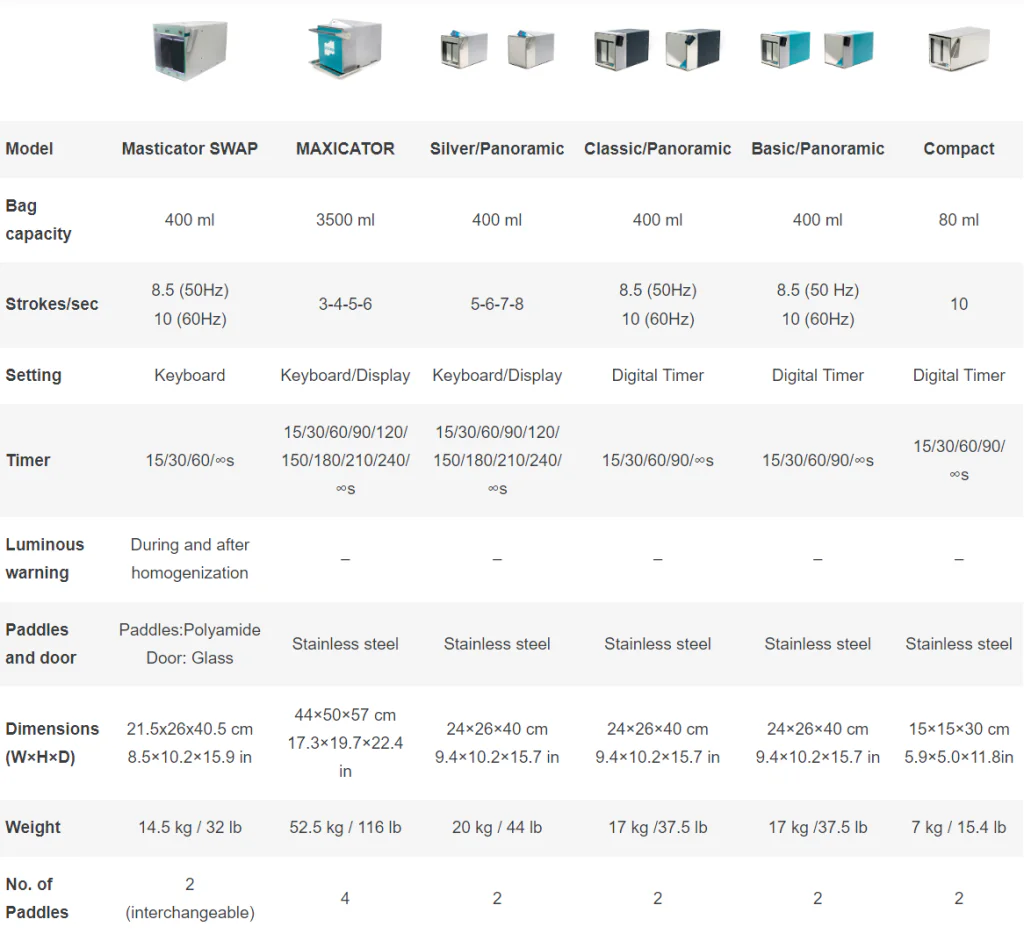 Lab Blender / bag homogenizer mixers are used for solid and semisolid samples by applying pressure to samples within sterile, disposable mixer bags (our Masticator homogenizing mixers accommodate most commercially available sterile mixer bags!), with unique metal spring paddle action.