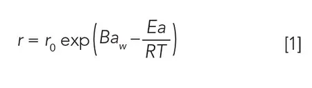 To aid in determining the ideal water activity for slowing down chemical degradation, the reaction rate can be predicted using shelf life models. To be effective, these models need to account for the effect of water activity and temperature. The only fundamental shelf life model that includes both water activity and temperature is hygrothermal time (8). It is derived from a form of the Eyring (9) equation for rate change and Gibbs equation for free energy and is given by equation 1.
