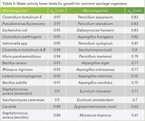 Each microorganism has an ideal internal water activity and their ability to reproduce and grow depends on maintaining that water activity. When a microorganism encounters an environment where the water activity is lower than their internal water activity, they experience osmotic stress and begin to lose water to the environment since water moves from high water activity (energy) to low water activity (3). This loss of water reduces turgor pressure and retards normal metabolic activity. To continue reproducing, the organism must lower its internal water activity below that of the environment. It tries to achieve this by concentrating solutes internally. The ability to reduce its internal water activity using these strategies is unique to each organism. Consequently, each microorganism has a unique limiting water activity below which they cannot grow (4,5). An organism’s ability to reproduce and grow does not depend on how much water is in its environment (moisture content), only on the energy of the water (water activity) and whether it can access that water for growth.