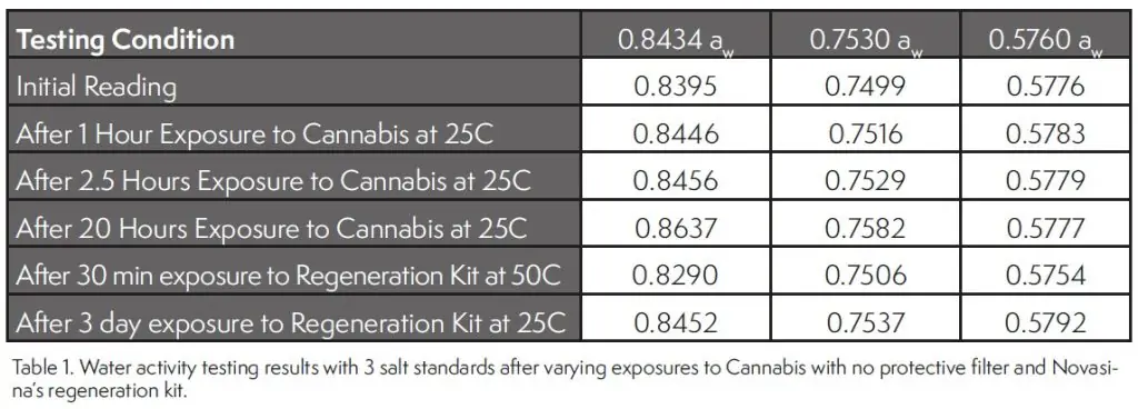 A recent testing study was conducted by Novasina using the LabMaster NEO where the electrolytic sensor was exposed to Cannabis flower without any protective filters for varying time periods to give more insight into the impact of Cannabis volatiles. The results of this study are shown in Table 1. The study indicated that exposure to Cannabis without a protective filter did result in changes in water activity readings on the SAL-T standards. However, the degree of change was not the same for all of the standards. The change due to exposure increased with the water activity of the standard with the 0.576 aw standard showing a maximum change of 0.003 aw, the 0.753 aw standard a maximum change of 0.005 aw, and the 0.8434 aw standard a maximum change of 0.02 aw. This would indicate that higher water activity readings are more impacted by exposure of the sensor to Cannabis than readings below 0.753 aw. As these results were all collected without a filter, they represent a worst-case-scenario, and the effects would be reduced and delayed when the correct protective filter is used. The results in Table 1 also indicate that the volatile effect on the electrolytic sensor from Cannabis can be reversed through prolonged exposure to the regeneration kit.