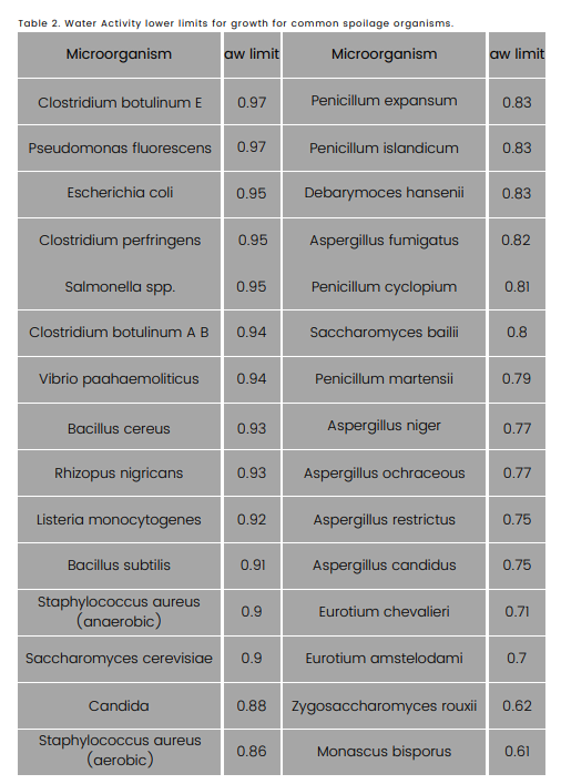 A list of the water activity lower limits for growth of common spoilage organisms can be found in Table 2. These growth limits indicate that all pathogenic bacteria stop growing at water activities less than 0.87 while the growth of common spoilage yeasts and molds stops at 0.70 aw, which is known as the practical limit. Only xerophilic and osmophilic organisms can grow below 0.70 aw and all microbial growth stops at water activities less than 0.60. In addition, microbial growth rate can be modeled using water activity, along with other growth factors such as temperature and pH. For a cannabis product to be considered shelf stable, it’s water activity must be less than 0.86 aw to ensure that no pathogenic bacteria will be able to grow on the product as it sits on the shelf. Cannabis products with a water activity higher than 0.70 aw but less than 0.86 aw are considered shelf stable but will still support the growth of mold and yeast.