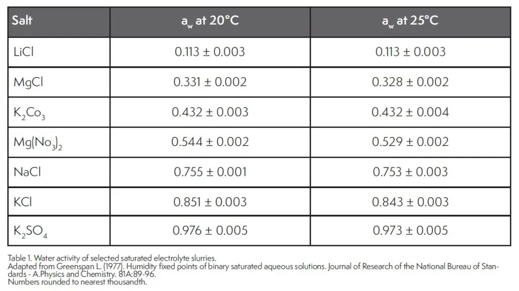 Independent water activity standards are made possible by the unique characteristics of crystalline electrolytes. These salts have well defined thermodynamic properties including that at saturation, the will remain a constant water activity if temperature remains constant. The water activity value of the saturated slurry depends on the type of salt and the temperature. Table 1 provides a short list of the water activity values of several saturated slurries and a more complete list is available from Greenspan (1977). A saturated slurry is prepared by starting with quantity of crystalline salt and then adding distilled water in small increments while stirring until the salt cannot absorb any more water as evidenced by it taking on the shape of the container, but not being easily poured (Fontana and Carter 2020).